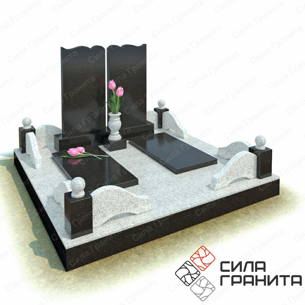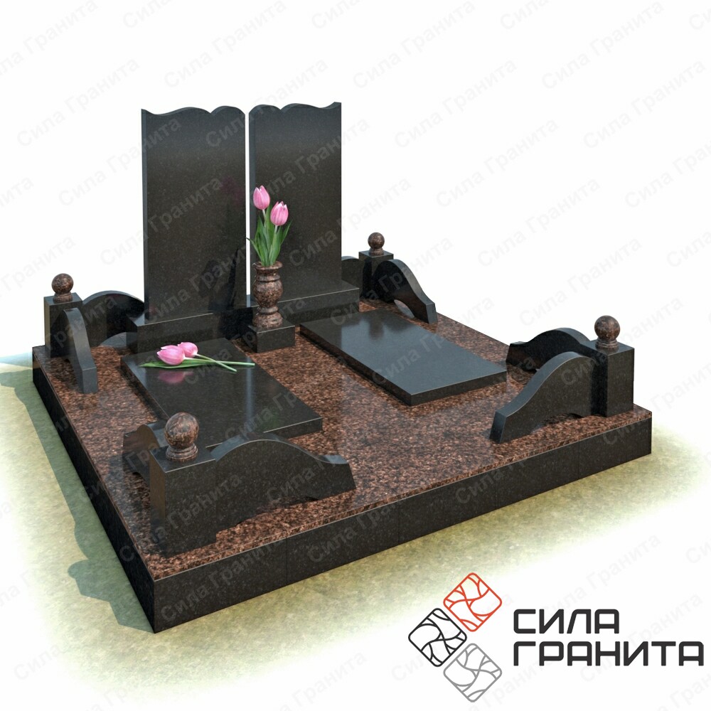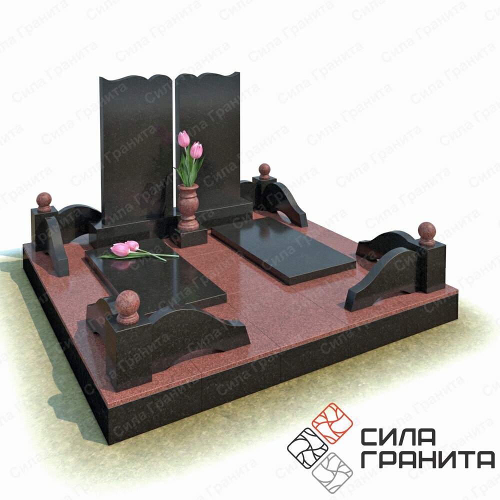 В стоимость входит Стандартная площадка размером 2000 *2000*100 облицованная гранитной плиткой, ограда из гранита, 2 памятника , 2 надгробные плиты, 2 гранитная подставка под вазу, ваза . Портрет и установка в стоимость не включены.