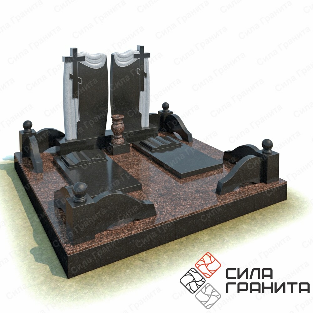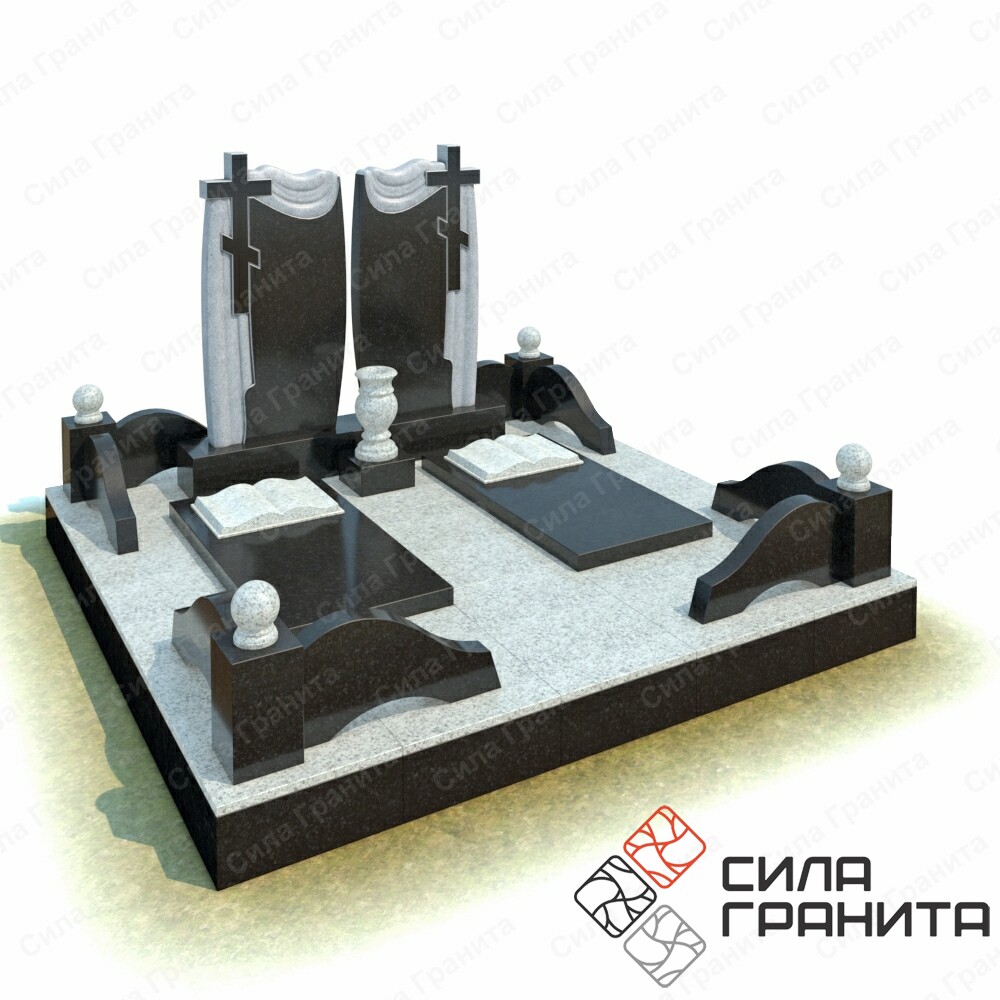 В стоимость входит Стандартная площадка размером 2000 *2000*100 облицованная гранитной плиткой, ограда из гранита, 2 памятника , 2 надгробные плиты, 2 книги из гранита, гранитная подставка под вазу, гранитная ваза. Портрет и установка в стоимость не включены.