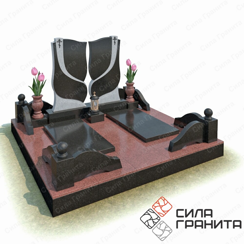 В стоимость входит Стандартная площадка размером 2000 *2000*100 облицованная гранитной плиткой, ограда из гранита, 2 памятника , 2 надгробные плиты, 2 гранитные подставки под вазы, 2 вазы, гранитная подставка под лампаду, лампада . Портрет и установка в стоимость не включены.