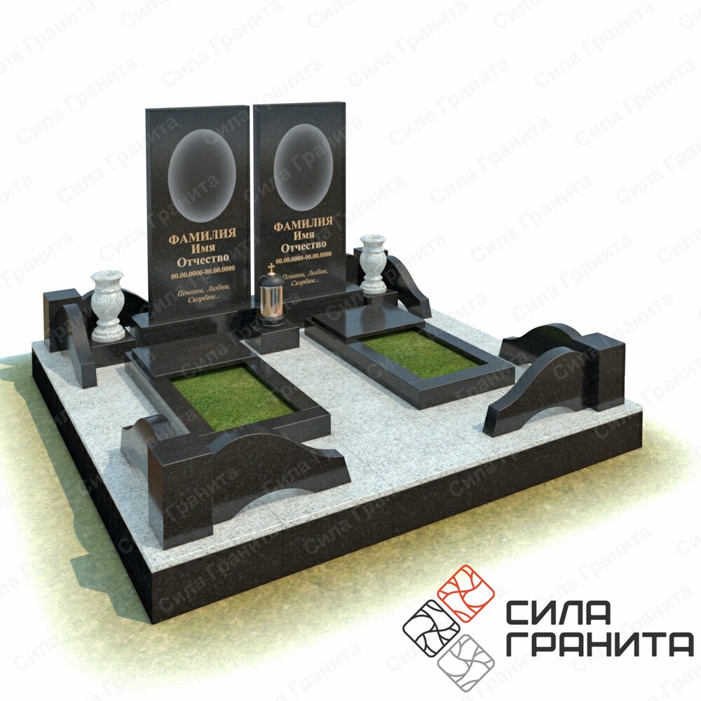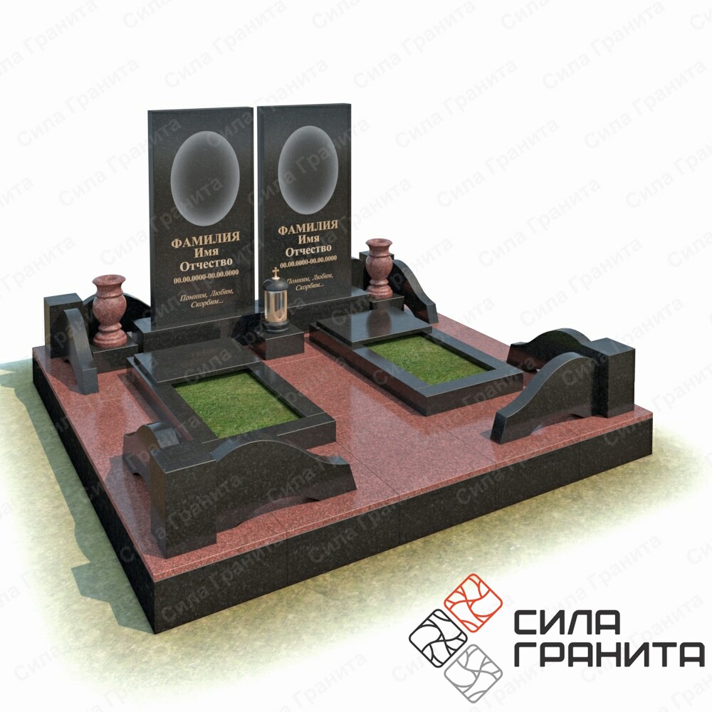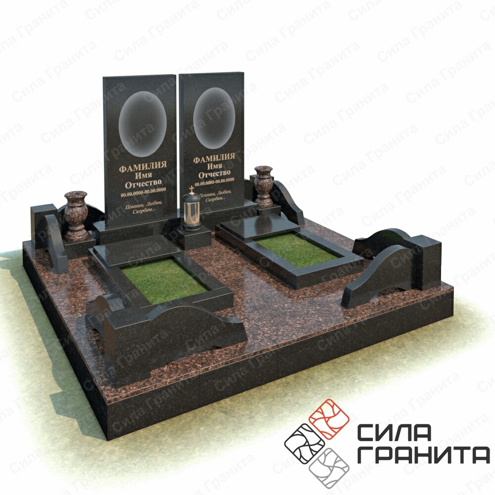 В стоимость входит Стандартная площадка размером 2000 *2000*100 облицованная гранитной плиткой, ограда из гранита, 2 памятника , 2 цветника, 2 гранитные подставки под вазы, 2 вазы, гранитная подставка под лампаду, лампада . Портрет и установка в стоимость не включены.