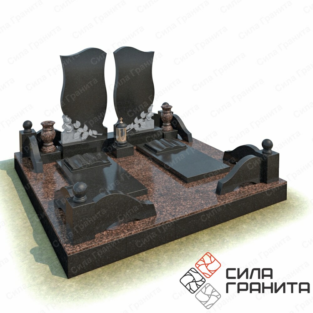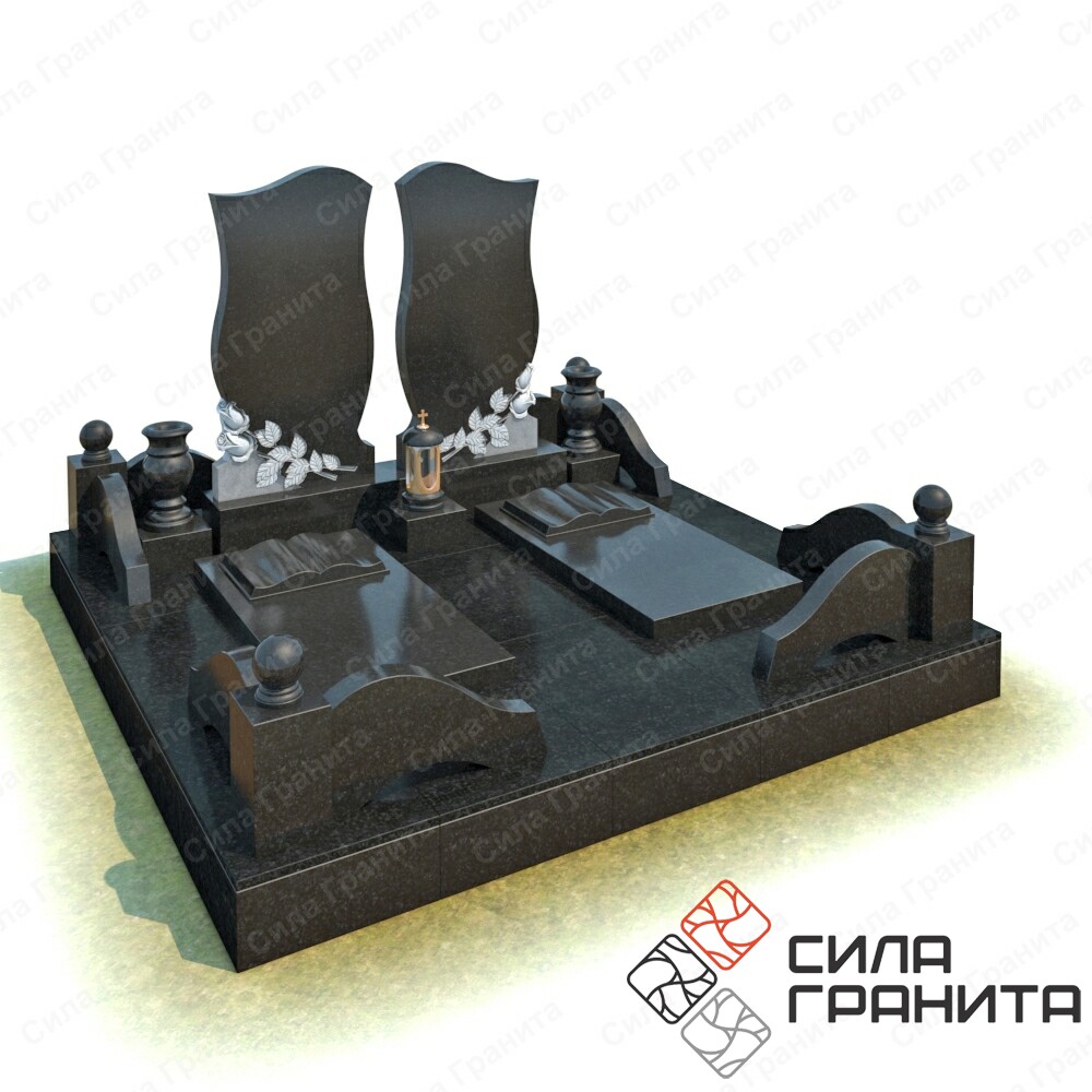 В стоимость входит Стандартная площадка размером 2000 *2000*100 облицованная гранитной плиткой, ограда из гранита, 2 памятника , 2 надгробные плиты, 2 книги из гранита, 2 гранитные подставки под вазы, 2 вазы . Портрет и установка в стоимость не включены.