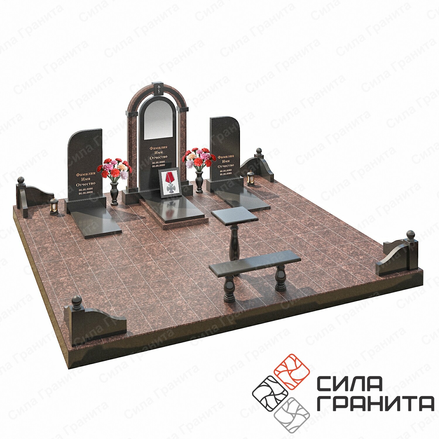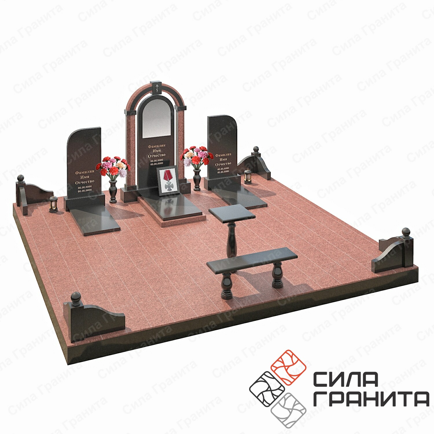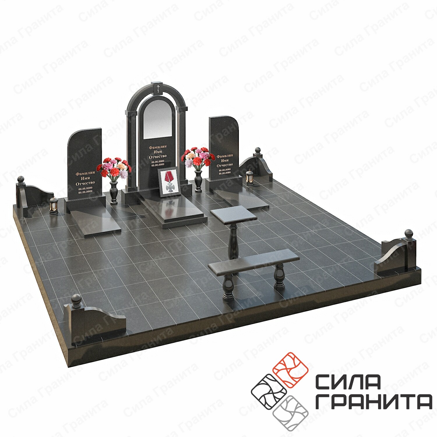 400*150*150Семейные памятники на троих позволят увековечить в камне особую связь покойных при жизни. Такие надгробия подойдут для установки на захоронении нескольких поколений. «Комплекс 545» с семейным памятником на могилу на троих включает в себя две боковые стелы и одну центральную с аркой и рамой под орден, они располагаются на индивидуальных тумбах, обеспечивающих устойчивость конструкции. Также ансамбль включает в себя площадку со столбами, уголками и шарами, столом и лавкой, цветником и надгробными плитами. Комплекс может быть изготовлен из натурального камня разных оттенков и фактур.